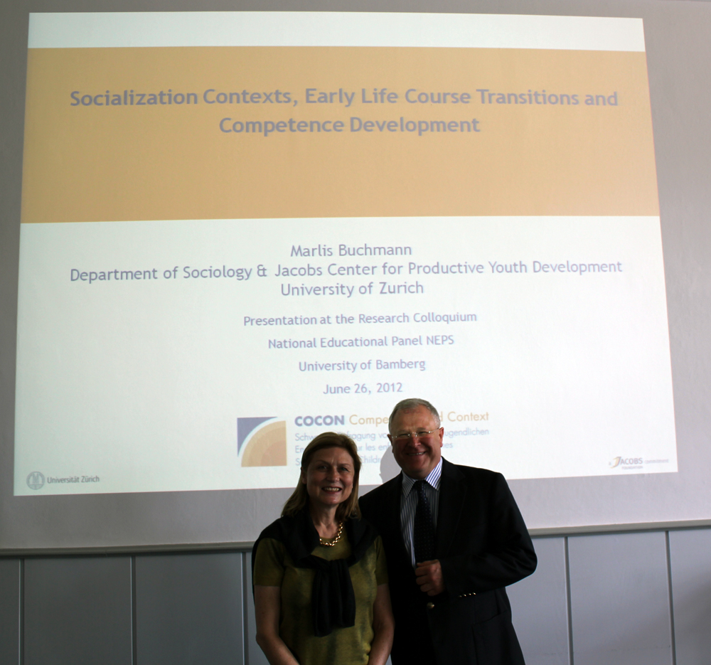 Sie stellte insbesondere die Schweizer Befragung von Kindern und Jugendlichen, die Studie Cocon Competence und Context, vor, welche in der deutsch- und französischsprachigen Schweiz mittels computer- und telefonbasierten Interviews sowie Fragebögen seit 2006 durchgeführt wird. Diese Längsschnittstudie erforscht wichtige Übergänge im Lebenslauf von Kindern und Jugendlichen (z.B. Schuleintritt) sowie die Aneignung sozialer und kognitiver Kompetenzen. Frau Buchmann schilderte die große Bedeutung der sozialen Beziehungen innerhalb und außerhalb der Familie und berichtete erste Ergebnisse, welche zeigen, dass für die Kohorte der 6-Jährigen insbesondere die Qualität der elterlichen Partnerschaft und das Ausmaß der emotionalen Nähe das prosoziale Verhalten der Kinder beeinflussen, während bei der Kohorte der 15-Jährigen auch die Größe des sozialen Netzwerks einen messbaren direkten Einfluss auf das gezeigte prosoziale Verhalten der Jugendlichen zu haben scheint. Weitere spannende Forschungsfragen der Cocon-Studie sind Genderunterschiede, welche sich bei der Qualität der Transition und der Auswirkungen auf den Schulerfolg zeigen. Erfreuliche Aussagen zur hohen Panelbeteiligung der Befragten auch bei der vierten Welle in 2012 machten Mut für die täglichen Herausforderungen einer Längsschnittstudie, welche auch die anwesenden NEPS-Wissenschaftlerinnen und Wissenschaftler kennen.