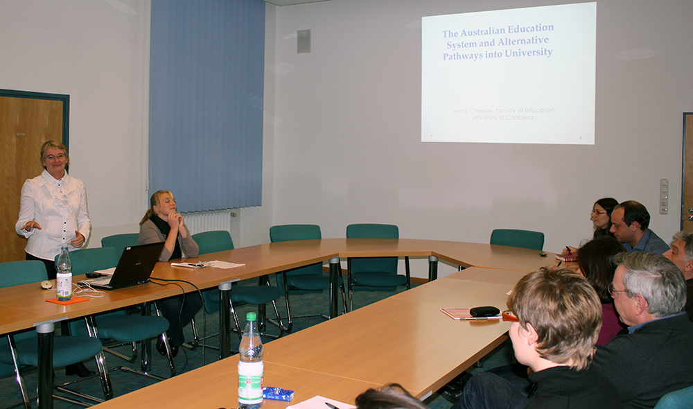 In einem ersten Gastvortrag zum Thema "The Australian Education System and Alternative Pathways into University" gab sie einen Überblick über das australische Bildungssystem und Wege in die Hochschule. Der Arbeitsmarkt in Australien verlangt mehr und mehr nach qualifizierten Kräften, zugleich öffneten sich die Hochschulen im Laufe der Zeit für nicht-traditionell Studierende. Dr. Jenny Chesters untersuchte anhand administrativer Daten die Wege nicht-traditionell Studierender im Bereich tertiärer Bildung.