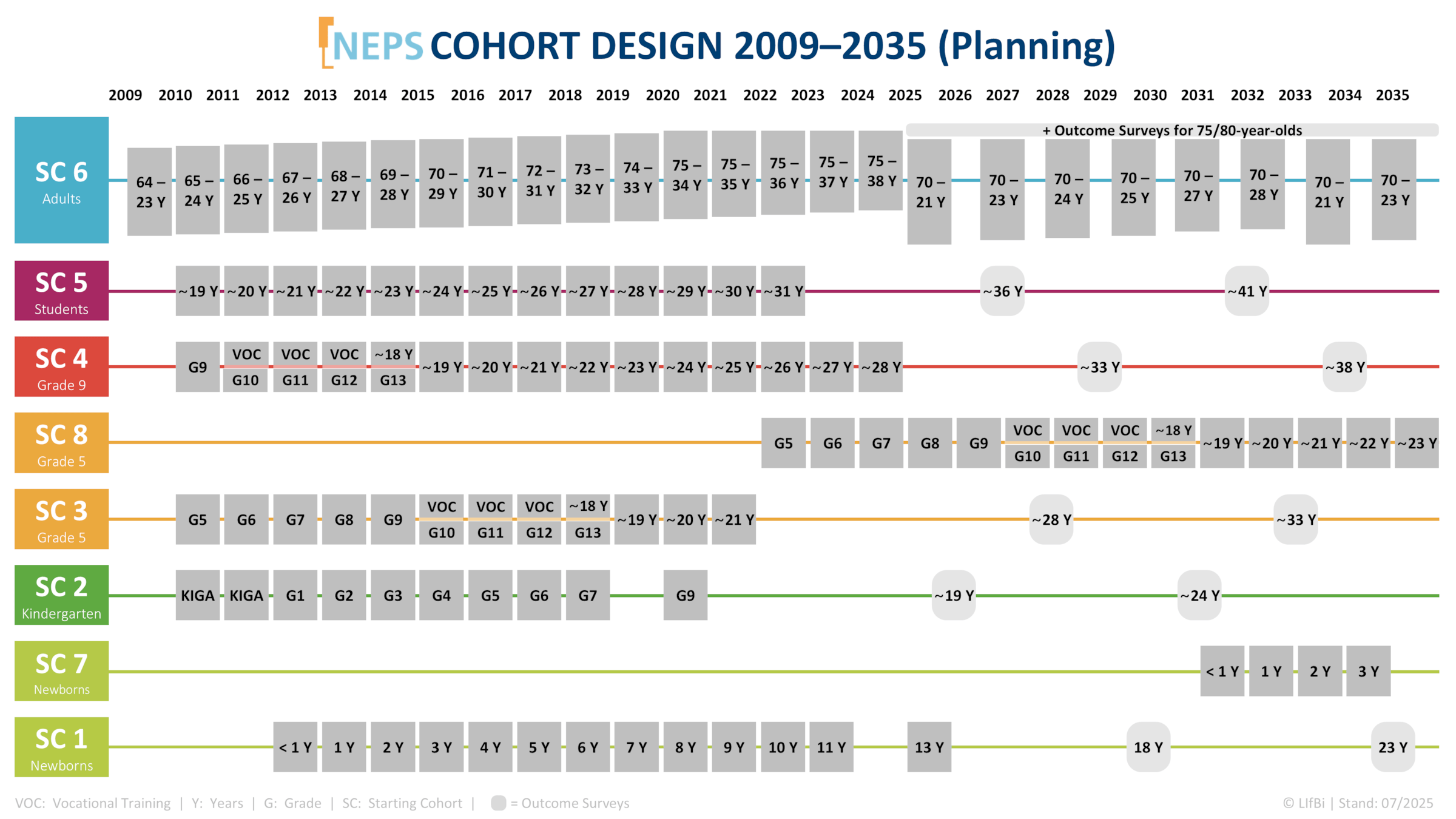 The NEPS participants are usually interviewed at close intervals and their competencies are continuously tested. In this way, they are accompanied by the NEPS throughout their different educational trajectories over several years. As the survey progresses, the core respondents of some starting cohorts are transferred to a wide-meshed survey cycle and surveyed every five years as part of an outcome survey on their current educational and employment status, as well as on key educational outcomes. Furthermore, an increase in younger birth cohorts and a refreshment of the existing birth cohorts was implemented in 2025/26 for the adult cohort (SC6). A new starting cohort in the area of early education, based on SC1, is planned with SC7 from 2031 onwards. The NEPS Cohort Design until 2035 is illustrated in the figure below.
